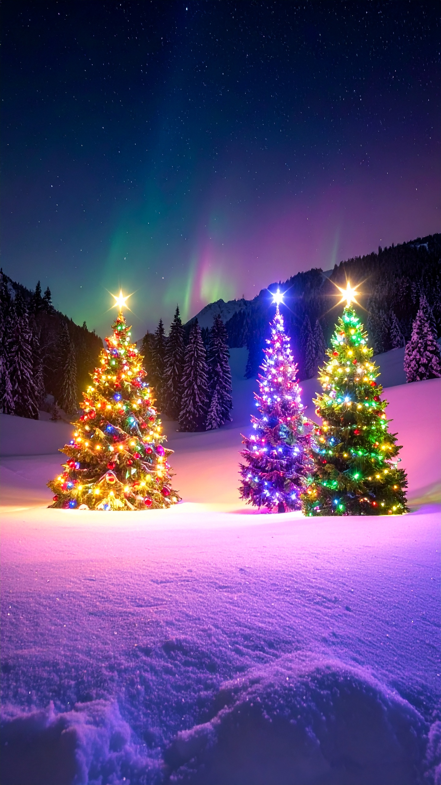 雪の降る夜に輝くクリスマスツリーとカラフルなイルミネーション04スマホ壁紙